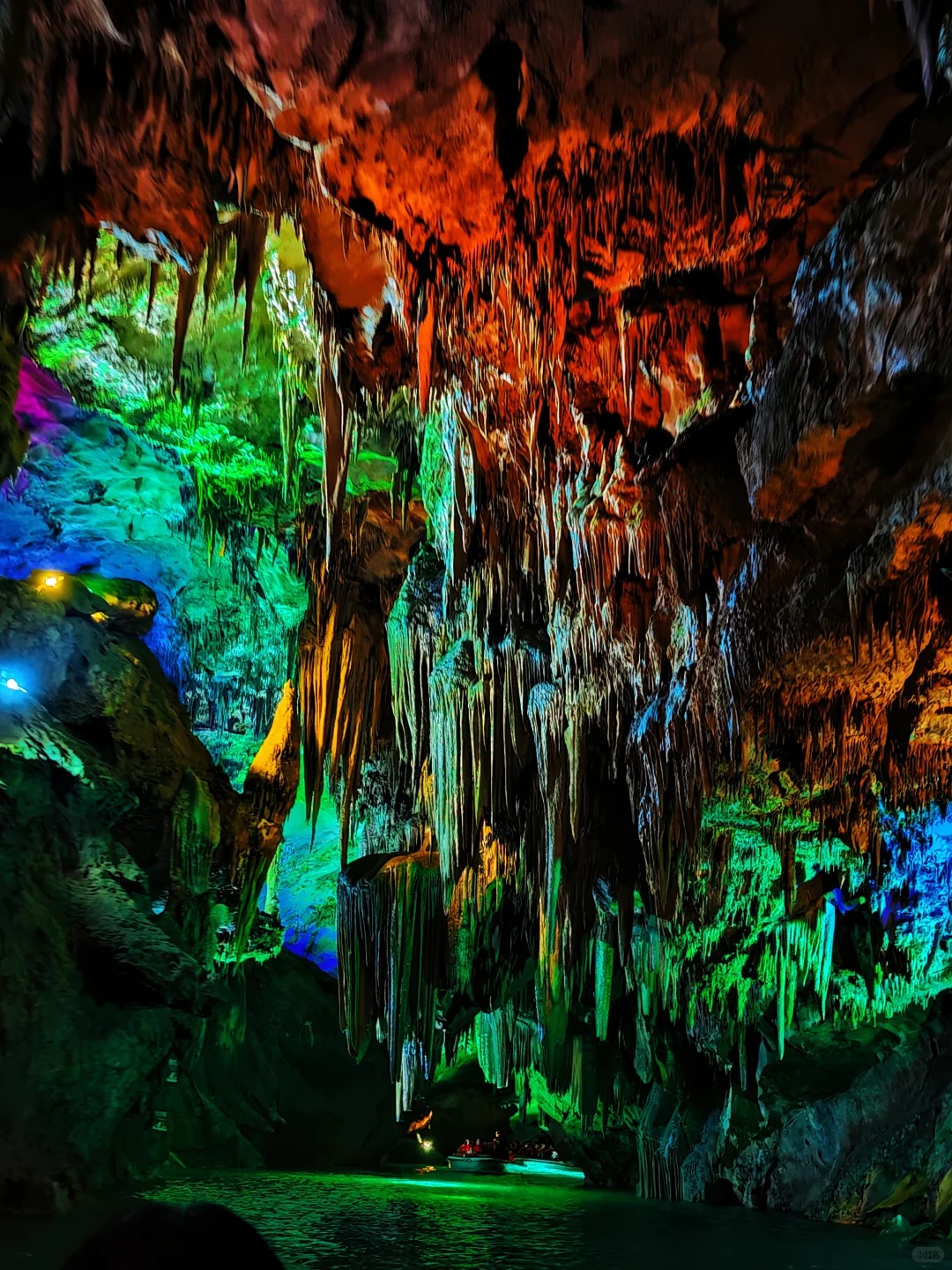 After exploring the Dry Cave, we got back on the boat and continued our journey. The second half of the cave is even more spectacular than the first, with larger chambers and more impressive formations. The “Palace of the Immortals” is the largest chamber in the cave, over 100 meters high and 50 meters wide. It’s filled with towering columns and huge stalactites that look like the palaces and gardens of the immortals. The lights here are bright and golden, making the entire chamber look like a royal palace.