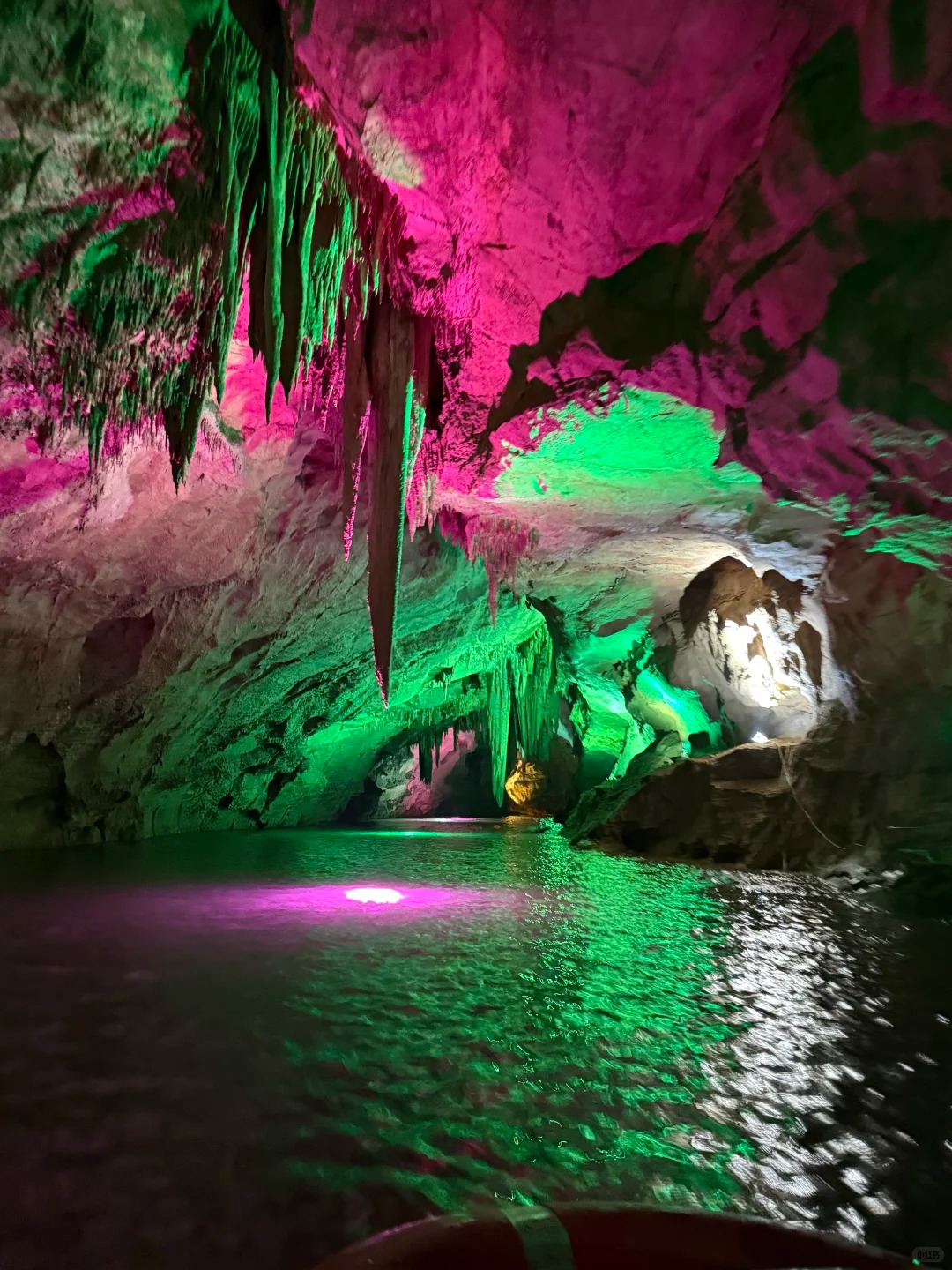 As I stepped onto the wooden boat, the guide handed me a life jacket and warned me to hold on tight. The boat glided slowly into the cave, and as we entered, the noise of the outside world disappeared, replaced by the gentle sound of water lapping against the boat and the distant drip of water from the cave ceiling. The cave is over 5,800 meters long, with the first 2,800 meters navigable by boat, and it’s filled with underground rivers and lakes that are crystal clear, reflecting the colorful lights like a mirror.