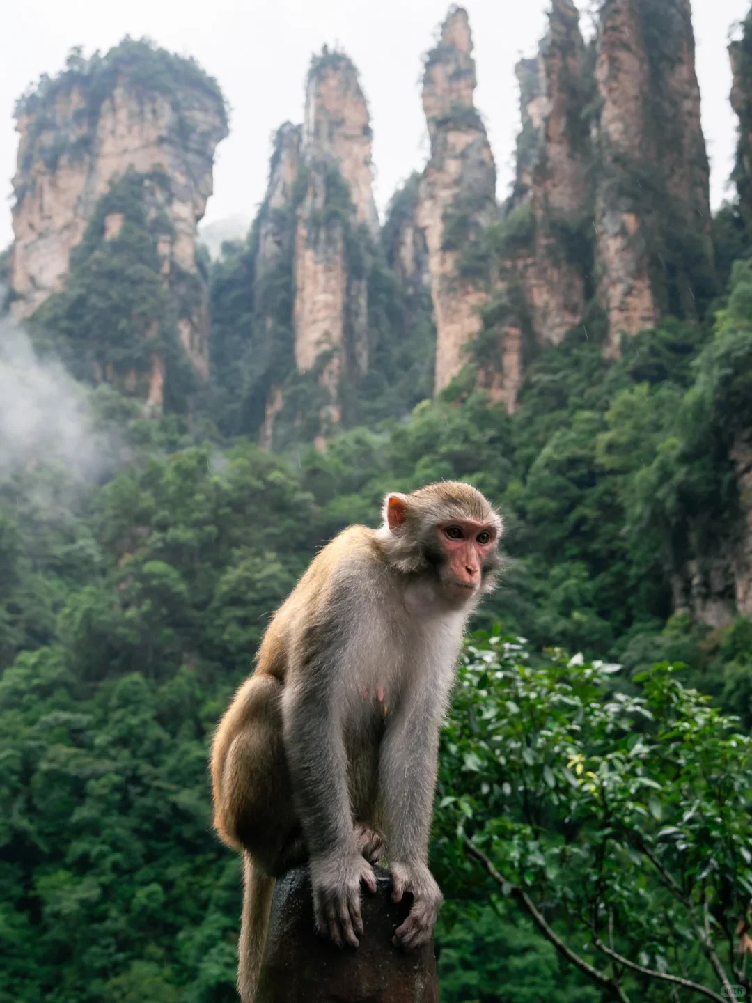 My hike began at the Golden Whip Stream (Jinbianxi). If you come here, do what I did: skip the crowds at the top for a few hours and start at the bottom. The path winds through a canyon that feels primeval. Towering sandstone pillars rise straight up like skyscrapers built by giants, covered in thick, verdant moss. I walked along the stream, the water so clear it looked like liquid glass. It was quiet here, save for the sound of rushing water and the occasional rustle in the trees. That rustle, I learned quickly, was the local wildlife. The wild monkeys of Zhangjiajie are notorious bandits. I saw a tourist lose a bag of chips within seconds of a monkey leaping from a branch. They are bold, aggressive, and hilarious to watch—as long as it’s not your food they’re stealing.