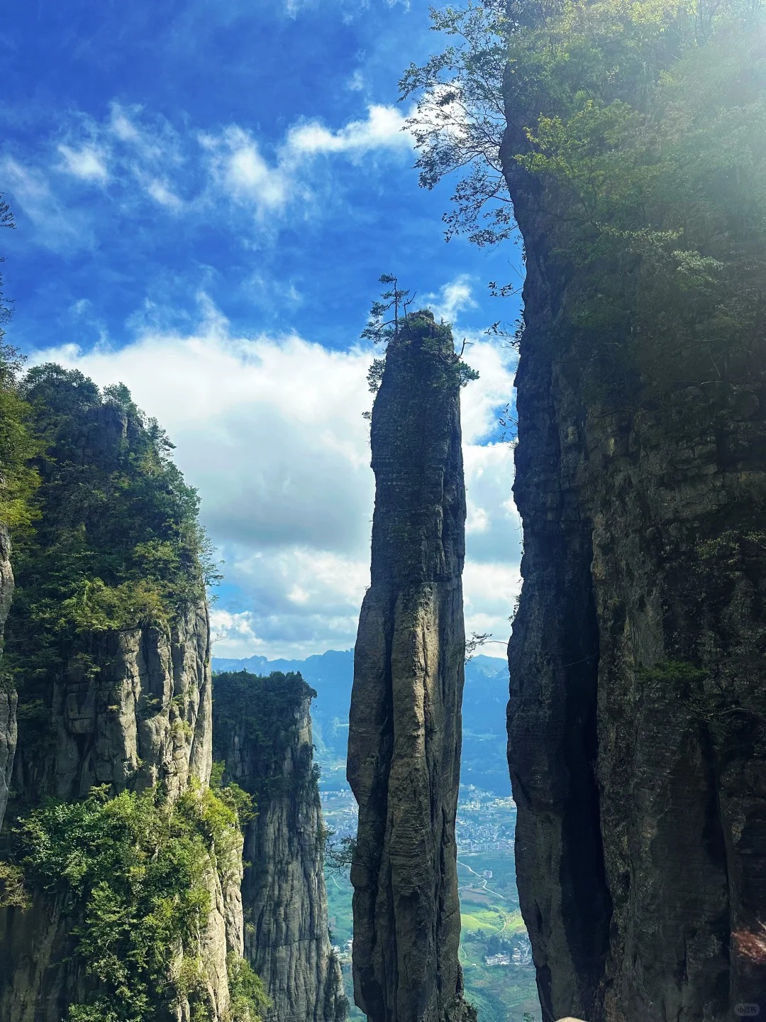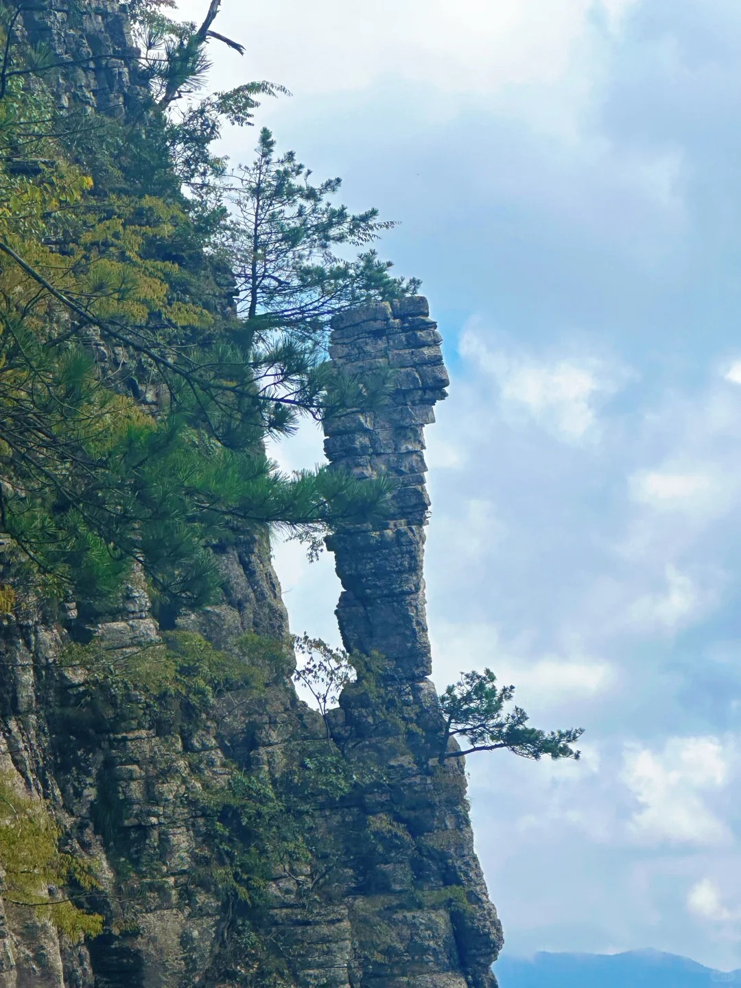 I forced myself to let go of the wall. The wind up here was fierce, whipping my hair across my face. I walked towards the "One Incense Stick" (Yizhu Xiang), the canyon's most famous rock formation. It defies physics. A slender pillar of rock, 150 meters tall but only 4 meters thick at its narrowest point, standing alone in the void. It looks like it could topple with a strong push, yet it has stood for millennia. Legend says it is an incense stick given by a deity to the local people to light in times of trouble.
