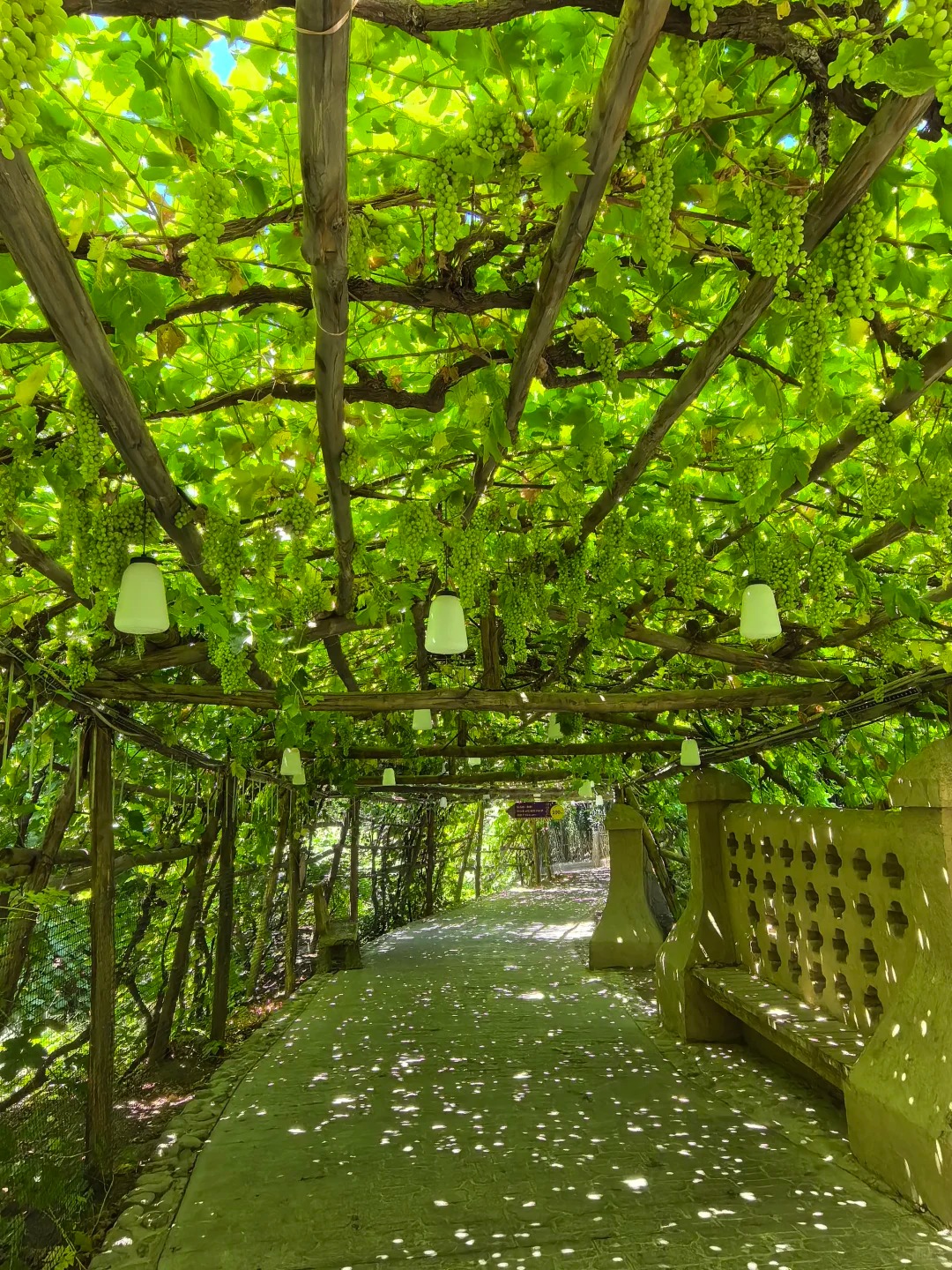 The Grape Valley is not just a tourist attraction; it is the lifeblood of Turpan. It is a lush strip of greenery, 8 kilometers long and half a kilometer wide, fed by the crystal-clear waters of the melted snow from the Tianshan Mountains. As I walked along the shaded paths, the contrast was overwhelming. On one side, the fiery red, dry mountains baked in the sun. On the other, a canopy of grape leaves filtering the light into a soft, dappled shade.