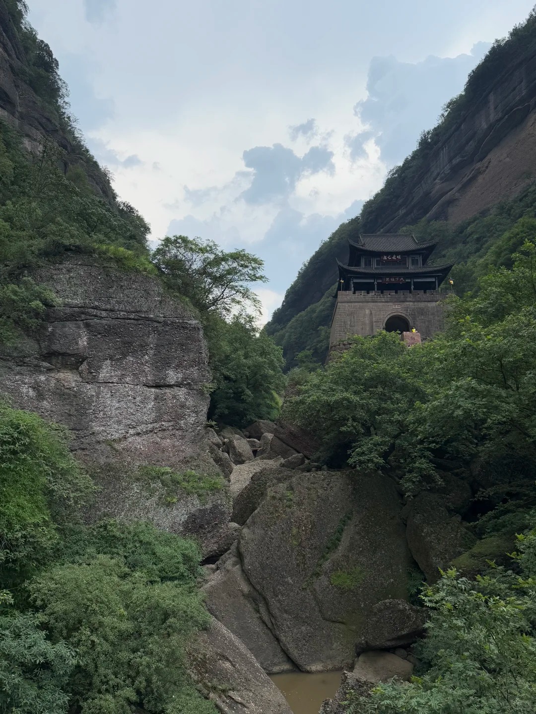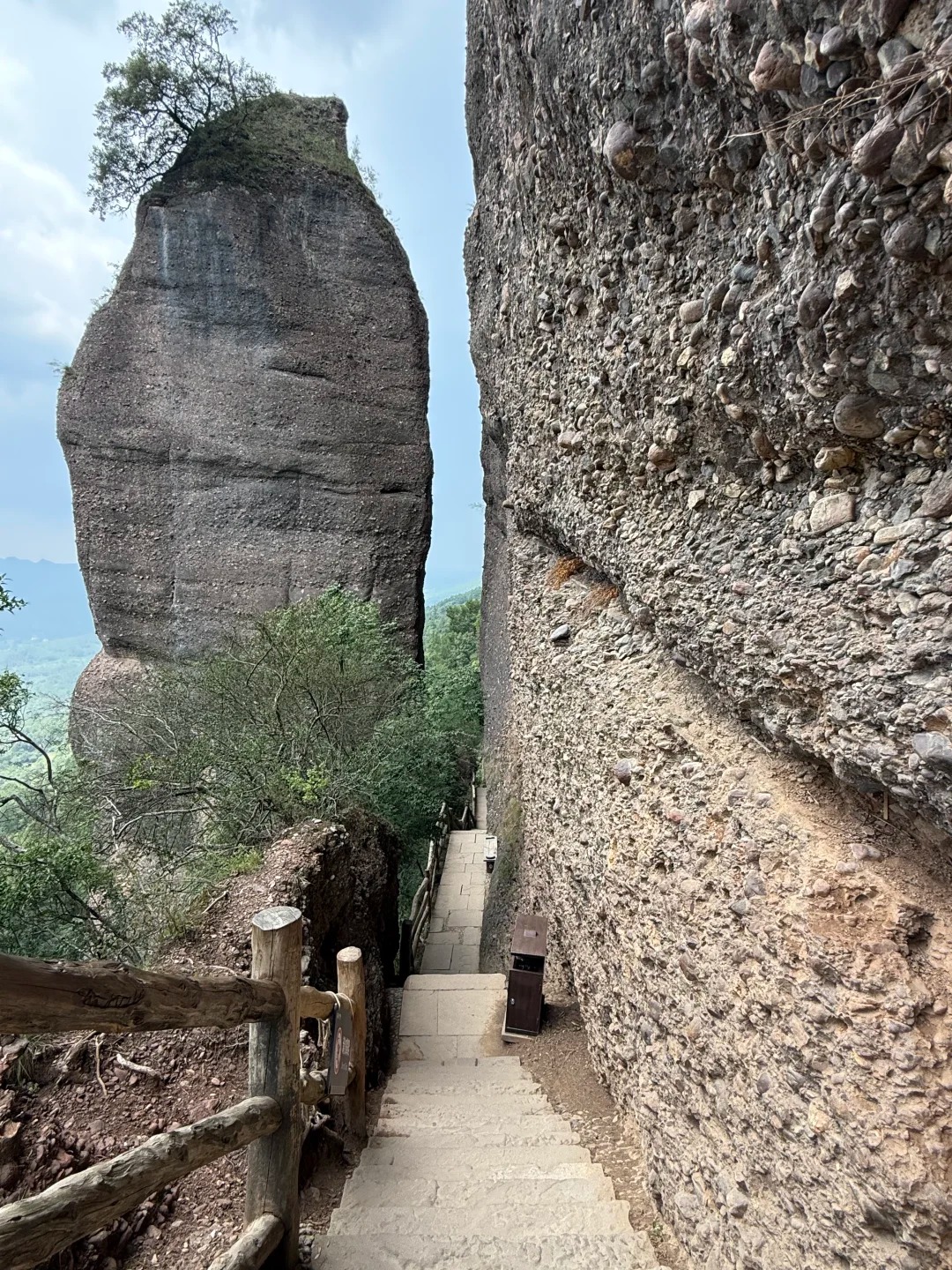I started my trek from the bottom of the valley. The atmosphere was humid and heavy. I walked past the “Lion Rock,” a solitary peak that stands like a sentry. But the real challenge was the Bird Plank Road. This is a narrow walkway carved into the sheer face of the cliff. In ancient times, it was the only way through the pass. Some parts are tunnels chiseled through the rock; others are wooden planks bolted into the cliff face, with nothing but air between your feet and the valley floor hundreds of meters below.