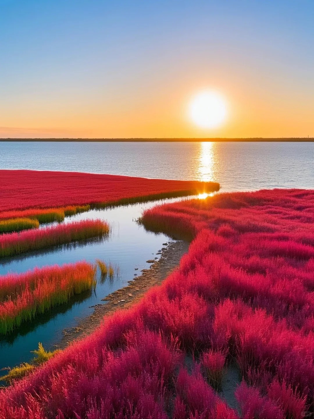 One of the most spectacular views was from the “Red Beach Scenic Area Observation Tower,” the highest point in the scenic area. From the top of the tower, I could see the entire red beach stretching out to the horizon, with the blue Bohai Sea in the distance. The contrast between the red beach, the blue sea, and the green reeds that grow along the edges of the wetland was breathtaking. I also noticed small streams winding through the red plants, their clear water reflecting the red color of the suaeda salsa, creating a beautiful mosaic of colors.