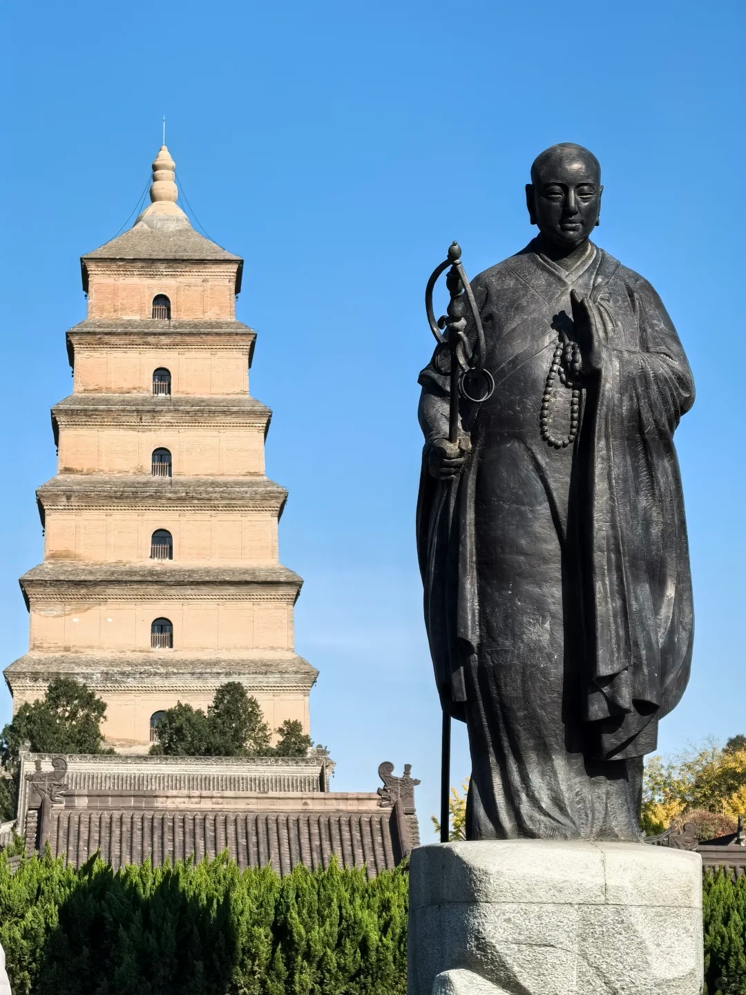 Reaching the top, I peered out of the arched window. The view was a shock. Straight ahead, the perfectly straight axis of modern Xi'an stretched out, lined with skyscrapers and neon lights. But looking down, directly below me, were the curved roofs of the temple, silent and geometric. It was a visual collision of the 7th century and the 21st. I imagined Xuanzang, the legendary monk who traveled to India and back, sitting right here (or in the original structure), translating sutras, looking out at a Chang'an that was the center of the world. Standing there, wiping sweat from my forehead, I felt a strange sense of continuity. Empires fall, skylines change, but this tower just keeps standing.