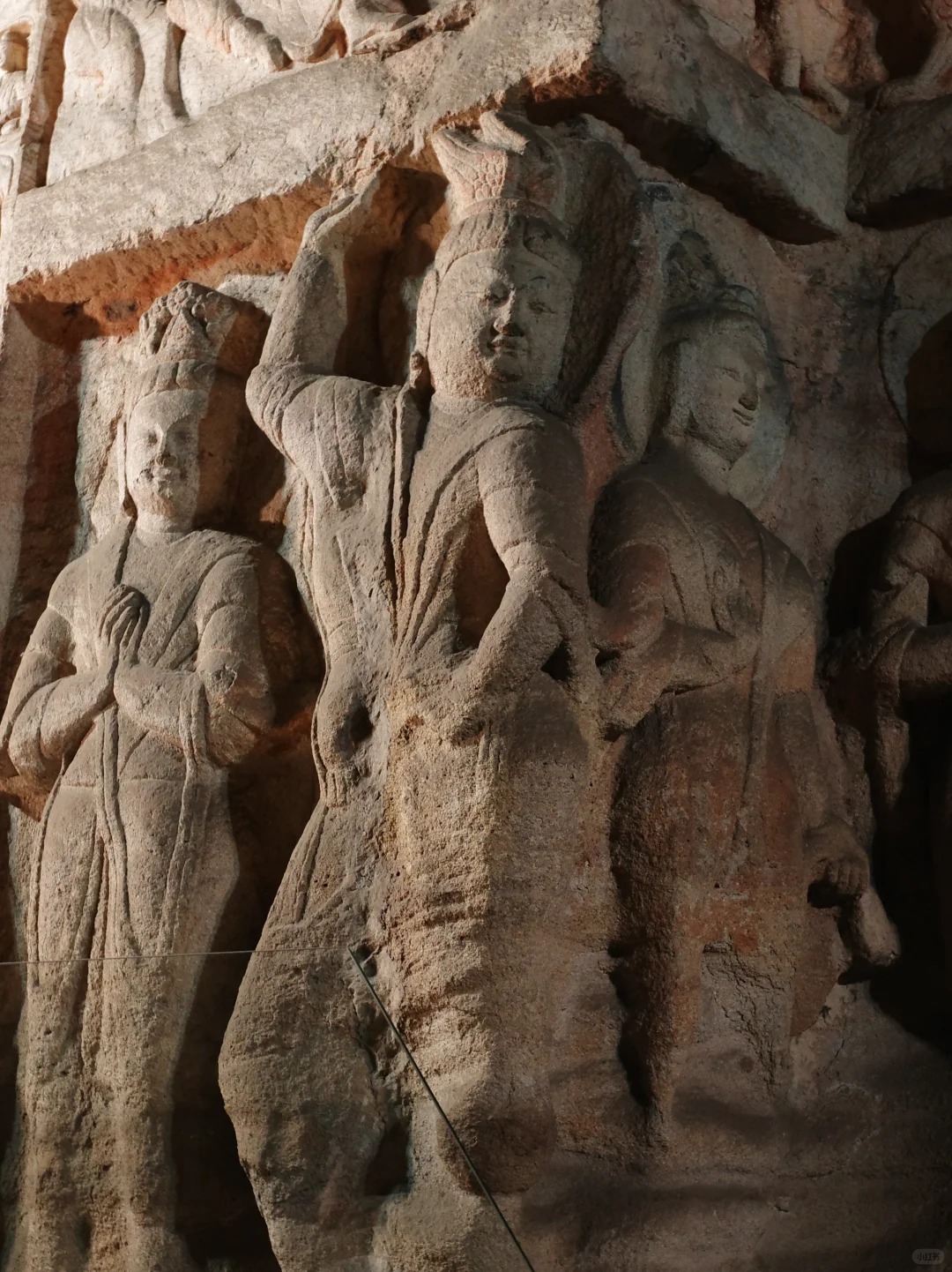 I spent a good hour just in Cave 6. This cave is a two-story structure known as the Sakyamuni Cave. The carvings here tell the life story of the Buddha. I traced the narrative around the walls: his birth as a prince, his departure from the palace, his enlightenment under the Bodhi tree. The relief work is incredible; the depth perception gives the figures a three-dimensional quality. It felt like watching a silent movie carved in rock. I noticed a small carving of a monkey in the corner, likely a playful addition by an apprentice sculptor. It humanized the entire work for me.