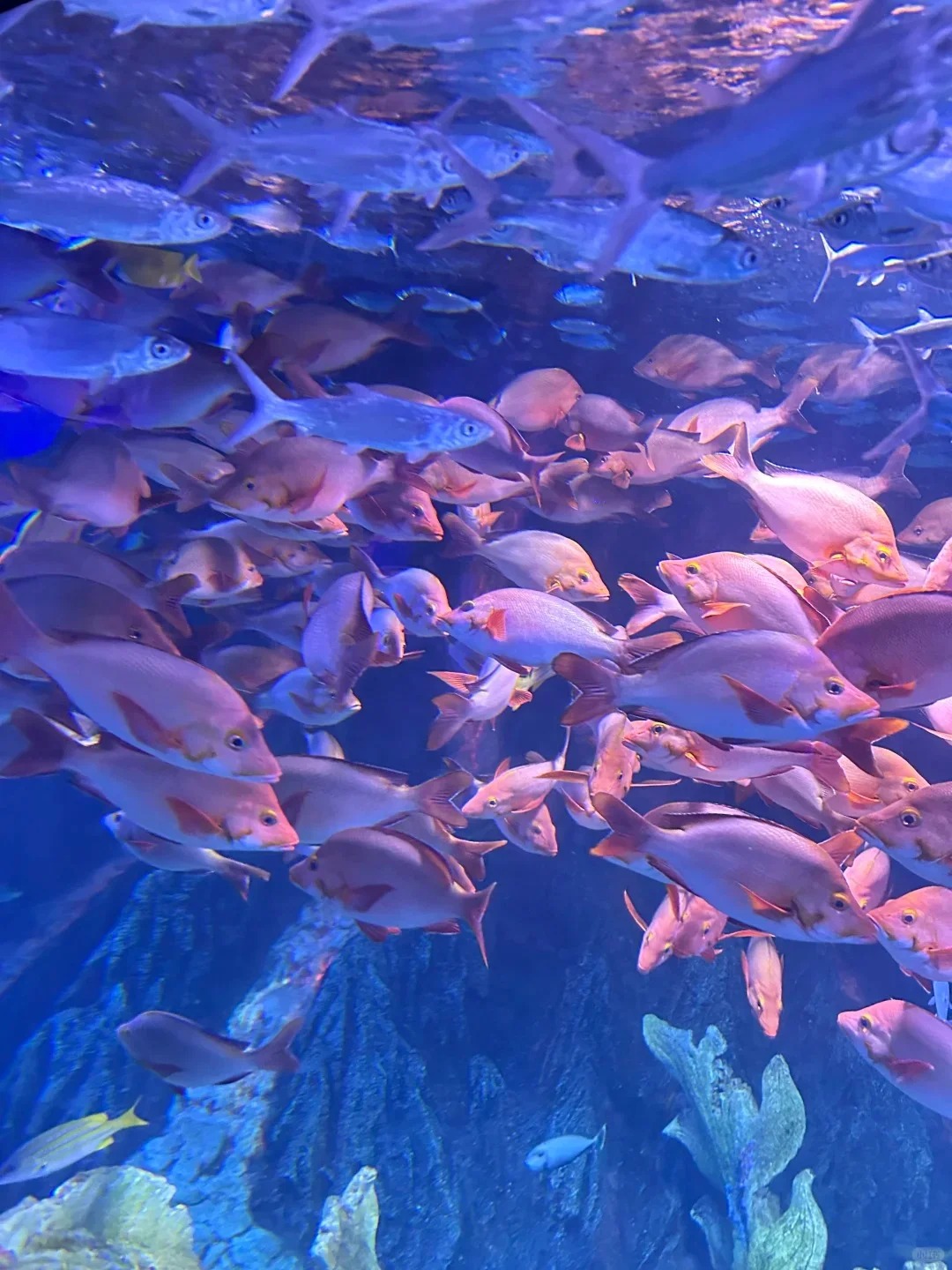 Walking into the main viewing area is like stepping into a cathedral, if cathedrals were built by Poseidon. The light in the room is dim, entirely blue, sourced only from the colossal tank itself. The panel is so wide and so tall that it fills your entire peripheral vision. You don't look at the fish; you are with them.